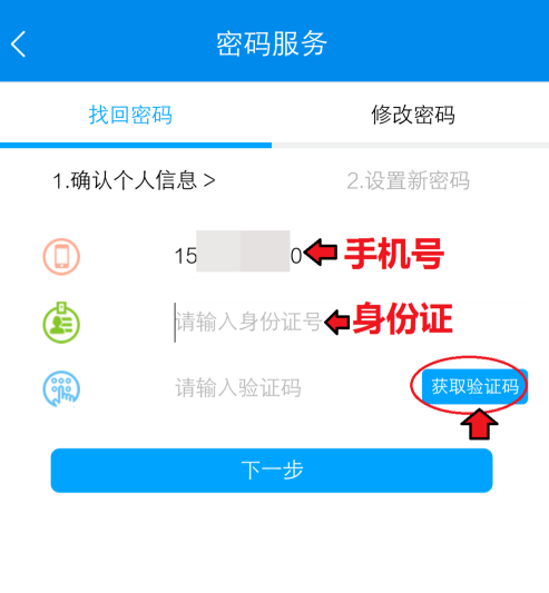 进入密码服务页面,输入身份证号,点击【获取验证码】。